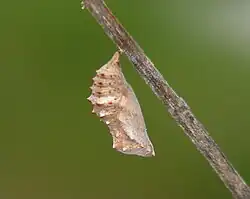 Die Puppe ist als Stürzpuppe ausgebildet und hängt an Zweigen oder Blattstielen. Sie ist graubraun gefärbt und mit einer Reihe von dorsolateralen Paaren von kurzen und spitzen Fortsätzen auf jedem Segment versehen. Nach ca. sechs Tagen der Entwicklung verfärbt sich die Puppe dunkelbraun und einige Zeichnungselemente der am nächsten Tag schlüpfenden Falter scheinen bereits durch die Puppenhaut.[2]