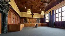 Im Jahr 1961 wurde der ursprüngliche Zustand des Neorenaissance-Saales aus dem Jahr 1916 weitgehend wiederhergestellt. Dabei wurden die Zuschauertribüne und die Neonbeleuchtung entfernt und die ursprüngliche Saalrückwand wieder eingezogen. Der weitgehend holzgetäfelte Saal mit profilierter Kassettendecke ist im Stil der späten Neorenaissance gehalten, die die Formen der Renaissance in zunehmend abstrahierender Art verwendete. Anstelle der im Jahr 1945 installierten Röhrenbeleuchtung sind unauffällig eingebaute Deckenfluter sowie Kristalllüster montiert. Die Bestuhlung des Saales ist modern. Die beiden marmornen Richtertüren zeigen in den bronzenen Supraporten Symbole der Gerechtigkeit (Waage, Gesetzestafeln der Zehn Gebote) und der Zeit (Stundenglas mit Flügeln und Stern). Das ebenfalls marmorne Hauptportal des Saales thematisiert in der bronzenen Supraporten-Kartusche den Sündenfall Adams und Evas am Baum der Erkenntnis von Gut und Böse als mythologisch ersten Gebotsverstoß des Menschen und dessen Ahndung durch Gott im biblischen Buch Genesis. Die von Früchten bekrönte Kartusche wird von nackten Jünglingen mit Tüchern flankiert, die das Germanische Recht (links, Schwert) und das Römische Recht (rechts, Fascis) personifizieren. Unterhalb der Kartusche ist das abgeschlagene und geflügelte Gorgoneion der Medusa mit schlangendurchzüngelten Haaren und schmerzverzerrtem Antlitz angebracht. Das Medusenhaupt ist als Symbol der Bestrafung in der antiken griechischen Mythologie zu deuten.[5] Über dem Richterstuhl hängt unterhalb der Saaldecke ein modernes bronzenes Kruzifix. Statt mit der üblichen Dornenkrone ist Jesus am Kreuz mit Königskrone dargestellt.