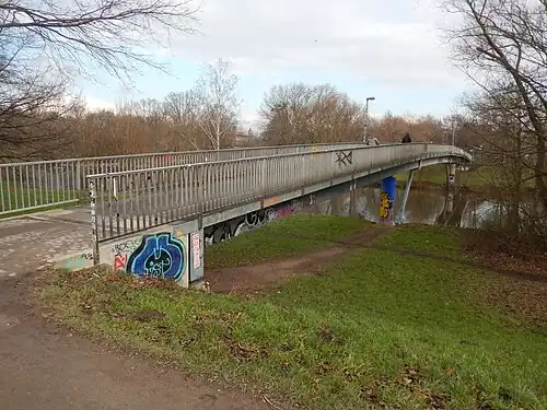 Die Justus-Garten-Brücke ist eine Fahrrad- und Fußgängerbrücke über die Ihme nahe dem Zusammenfluss mit der Leine in Hannover. Die schlanke Stahlträgerbrücke verbindet seit 1980 die hannoverschen Stadtteile Calenberger Neustadt und Linden-Nord.[1] Sie ermöglicht eine Flussquerung an Stelle eines früheren Fährbetriebs. Ihren Namen erhielt sie nach dem um 1900 wenige Meter flussabwärts gelegenen Ausflugslokal „Justus Garten“.[2] Neben der Brücke liegt das Veranstaltungsgelände des Fährmannsfest Hannover.