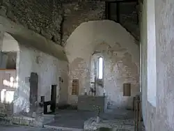 Das heutige Dach überdeckt sowohl die Reste des Turms als auch das Langhaus und den Chor. Von den Gewölben ist nichts erhalten, ebenso vom Zwischen- und Obergeschoss. Die Reste der Gewölbe sind als Ansätze noch im Mauerwerk erkennbar. Die Schießscharten im Obergeschoss sind nur von innen sichtbar und werden außen von Putz verdeckt.