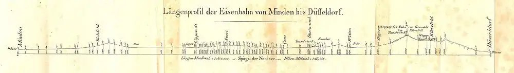 Am 18. Dezember 1843 erhielt die Cöln-Mindener Eisenbahn-Gesellschaft dann die preußische Konzession für die Strecke von Deutz über Mülheim am Rhein, Düsseldorf, Duisburg, Oberhausen, Altenessen, Gelsenkirchen, Wanne, Herne und Castrop-Rauxel nach Dortmund und weiter über Hamm, Oelde, Rheda, Bielefeld und Herford bis nach Minden. Mit dieser Streckenführung wurde die billigere Variante gewählt, die das Bergische Land nördlich weiträumig umfuhr.