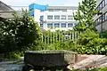 | Köln-Riehl, Kinderkrankenhaus Amsterdamer Straße. Die vor dem Haupteingang gelegene Brunnenanlage aus vier Waschbetonbecken wurde 1962 nach einem Entwurf von Professor Benno Schachner (1902–1987) installiert.[17] | |