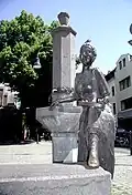 | Der Nonnibrunnen in Köln-Ehrenfeld wurde um 1965 auf einem kleinen Platz an der Kirche St. Bartholomäus am Melatener Weg aufgestellt. Es ist eine Bronze des Künstlers Lambert Schmitthausen.[17] Die Skulptur des Brunnens stellt einen lesenden Jugendlichen dar und soll an den 1944 in Köln verstorbenen Jugendbuchautor Jón Sveinsson (Nonni) erinnern. Neben der Figur befindet sich ebenerdig ein kleines, heute mit Kieselstein gefülltes Betonbecken. | |