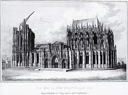 Nach Einstellung der Bauarbeiten am Kölner Dom im Jahr 1520 vergingen über drei Jahrhunderte, bis dessen Weiterbau begonnen und 1880 schließlich abgeschlossen wurde. Die Vollendung des Kölner Doms war mit verschiedenen Erwartungen verknüpft und erfüllte nach Thomas Nipperdey eine „Omnibus-Funktion“:[1] Unterschiedlichen politischen Gruppierungen – beispielsweise konservativ-föderalistischen oder liberal-demokratischen – war es gleichermaßen möglich, sich aktiv für den Dombau einzusetzen. 1842 erfolgten die Gründung des Zentral-Dombau-Vereins (ZDV) sowie die Grundsteinlegung für den Weiterbau des Doms. Zuvor konnte der preußische Kronprinz Friedrich Wilhelm (IV.) als Förderer gewonnen werden, der sich beim ersten Dombaufest am 14. August 1842 zum Protektor der Domvollendung zu stilisieren versuchte.[1] Bis August 1848 waren die Seitenschiffe von Lang- und Querhaus eingewölbt und die Mittelschiffe hatten die Höhe des Triforiums erreicht. Im Innenraum der Kathedrale fanden durch die Verbindung von Chor und Turmbauten mehrere tausend Menschen Platz.