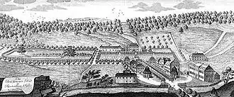 Eine Skizze des Staatsbades von 1781 zeigt die Kuranlage mit der Eiche und dem Wappen von Heinrich von Bibra, Fürstbischof von Fulda.