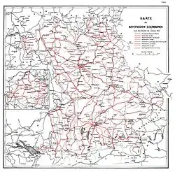 In den folgenden Jahrzehnten wurde das Staatsbahnnetz mehr und mehr ausgebaut, Lücken wurden geschlossen. Zu Beginn des 20. Jahrhunderts war das Land mit Hilfe eines weitverzweigten Lokalbahnnetzes erschlossen. 1907 wurde die Generaldirektion der Königlich Bayerischen Staatseisenbahnen aufgelöst, ihre Zuständigkeiten wurden auf die einzelnen Direktionen verteilt.[10]