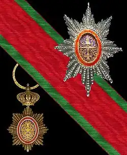 Das Ordensband war ursprünglich rot mit grünen Randstreifen. Da die Ähnlichkeit zum roten Band der Ehrenlegion zu groß war, entschloss man sich 1898 zu einem weißen Band mit orangen Randstreifen. Seit 1948 wird der Orden wieder an dem ursprünglichen Band verliehen und getragen.