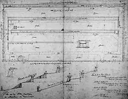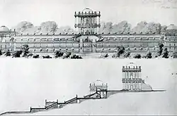 Alexis Lepère ließ ab 1859 durch Minister Moritz August von Bethmann-Hollweg jährlich Pfirsiche, Äpfel und Birnen von den durch ihn errichteten Anlagen in Norddeutschland bei Königin Augusta vorlegen, um sich als Gärtner zu empfehlen. Im Sommer 1862 schließlich erteilte ihm Wilhelm I. den Auftrag, auch auf dem Klausberg eine Maueranlage für den Obstbau zu errichten.[9] Im Herbst des Jahres entstand unter Lepères Anleitung am königlichen Weinberg eine 128 Fuß lange, von Osten nach Westen ziehende Maueranlage, von der nach Süden hin vier jeweils 56 Fuß lange Mauern liefen. Zum Schutz vor Witterungseinflüssen waren auf der Mauerkrone vorspringende Schutzdächer angebracht, an denen im Frühjahr zusätzlich hölzerne Schutzläden befestigt wurden, um die blühenden Bäume vor Frösten zu schützen.