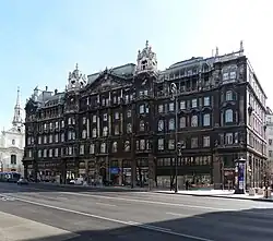 Das ursprüngliche Erscheinungsbild des vierstöckigen Gebäudes war von einer reich gegliederten Fassade, einer aufwändigen Dachlandschaft mit Steintürmchen, Ziergittern und einem Tempelgiebel zwischen den beiden überkuppelten Mittelrisaliten geprägt. Diese beiden Kuppeln stehen mit den Türmen der benachbarten Klothilden-Paläste im Einklang und bilden somit ein beinah einheitliches Bauensemble. Die platzseitigen, steinverkleideten Nord- und Ostfassaden sind reich mit kolossalen Säulen, Obelisken und anderen bildhauerischen Ornamenten verziert. Die straßenseitigen, verputzten Süd- und Westfassaden sind einfacher gehalten. Das Gebäude verfügt über zwei herrschaftliche Treppenhäuser, die Flügel sind durch einen überglasten Innenhof miteinander verbunden. Eines der sechs Servicetreppenhäuser wurde durch einen Bombenangriff im Zweiten Weltkrieg zerstört und nicht wieder aufgebaut. Der Balkon über dem Haupteingang wird von zwei, ungarische Stammesmänner darstellenden, als Hermen ausgebildeten Atlanten getragen.[5]