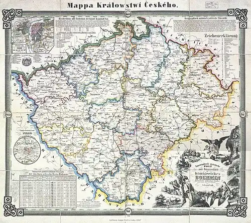 Die Institutionen wurden ab 1848 demokratisiert. Am 30. Dezember 1849 wurde die erste moderne Landesverfassung für Böhmen erlassen.[9] Sie wurde 1851 wieder aufgehoben und mit deren Wiedereinsetzung durch das Februarpatent 1861 zur Grundlage der neuen konstitutionellen Monarchie.