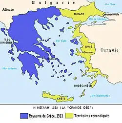 Von 1918 bis 1923 besetzte Griechenland das albanische Nordepirus und während des Griechisch-Türkischen Krieges von 1919 bis 1923 ab 1920 die türkischen Gebiete Ostthrakien und Izmir und eroberte 1923 Westthrakien. 1920 forderte das Königreich die „Rückgabe“ Istanbuls, um es als Erinnerung an das mittelalterliche Konstantinopel zur Hauptstadt zu machen. Nach dem Verlust der türkischen Gebiete wanderten viele dort lebenden Griechen in das Kernland ein und die Megali Idea zur Wiederherstellung des Byzantinischen Reiches wurde aufgegeben.[7]