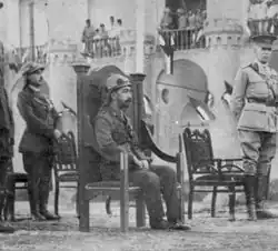 Im Zweiten Weltkrieg war der Irak, dessen Regierung den Briten traditionell freundlich gesinnt war, auf der Seite der Alliierten. Doch im April 1941 kam es erneut zu einem Putsch von Offizieren, wobei der probritische Premierminister Nuri as-Said abgesetzt wurde und Raschid Ali al-Gailani das Amt übernahm. Die Monarchie wurde beibehalten und die im Vertrag von 1930 festgeschriebenen Rechte der Briten wurden weitgehend eingeschränkt. Dies führte zu militärischen Auseinandersetzungen zwischen der irakischen Armee und den Briten.[11] Der Militärputsch wurde vom nationalsozialistischen Deutschland gutgeheißen und materiell unterstützt, Hauptfigur war dabei der Agent Fritz Grobba. Die neue Regierung war den Achsenmächten zugetan.[11] Sie stand unter der Leitung des Raschid Ali al-Gailani, als sogenannte „Regierung der Nationalen Verteidigung“. Nach wenigen Wochen wurde seine Putschregierung von britischen Truppen gestürzt und an ihre Stelle wieder eine probritische Regierung unter Nuri as-Said eingesetzt.[12]
