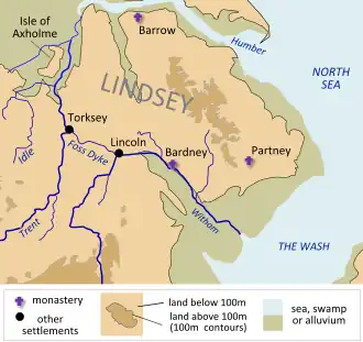 Der Missionar Paulinus wirkte in den 620er Jahren in Lindsey, als es unter der Vorherrschaft Edwins von Northumbria stand, und errichtete in Lincoln eine Kirche.[3] In der Mitte des 7. Jahrhunderts wurde Lindsey durch Penda von Mercia dominiert. 674 besiegte Ecgfrith von Northumbria König Wulfhere von Mercia und nahm von diesem Lindsey in Besitz.[5] Theodor von Tarsus, der Erzbischof von Canterbury, erhob Lindsey 677 zu einem eigenständigen Bistum[6] und Eadhæd wurde der erste Bischof.[7] Im Jahr 679 kam es am Trent zu einer weiteren Schlacht zwischen Ecgfrith und Æthelred von Mercia.[5] Im Anschluss an die Schlacht vermittelte Theodor von Tarsus, der Erzbischof von Canterbury, einen Frieden, wonach Lindsey an Mercia fiel. Überregionale Bedeutung hatte das Kloster Beardeneu (Bardney Abbey) in dem Oswald von Northumbria[8] und Æthelred von Mercia[9] beigesetzt wurden.
