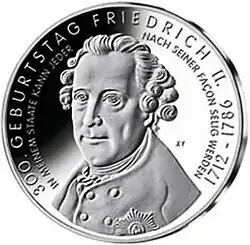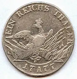 Formell galt für das Heilige Römische Reich die in den Münzedikten von 1551, 1559 und 1566 geschaffene Reichsmünzordnung auch im 17. Jahrhundert bestehen. Die Normen wurden allerdings nicht beachtet, so dass der brandenburgische Kurfürst zusammen mit dem sächsischen Kurfürsten eine eigene Münzkonvention erließ. Seit 1667 galt für Brandenburg-Preußen die Münzkonvention von Zinna. Der preußisch-österreichische Dualismus führte zu währungspolitischen Umwälzungen, die das Gebiet des Heiligen Römischen Reiches in zwei Währungsgebiete aufteilte. 1750 führte Friedrich II. nach dem Plan seines Münzdirektors Johann Philipp Graumann eine Münzreform durch. Durch die Graumann’sche Münzreform wurde der 14-Talerfuß in Preußen eingeführt. Außerdem gab Preußen die etwas leichtere Reichstaler und Goldmünzen, die Friedrich d’or aus. Durch die Reform wurde Preußen währungspolitisch unabhängig vom Ausland. 1821 Im Rahmen einer Münzreform wurde der preußische Taler in 30 Silbergroschen zu je 12 Pfennigen eingeteilt.[31]