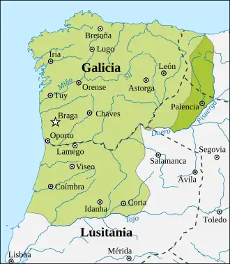 Galiciens Teilung zwischen den Sueben und den Hasdingischen Vandalen placierte die Sueben in den Westen der Provinz – an die Küste des Atlantiks,[21] höchstwahrscheinlich zwischen den heutigen Städten Porto im Süden und Pontevedra im Norden. Bald sollte Braga ihre Hauptstadt werden, später expandierten sie nach Astorga, in die Region von Lugo und in das Tal des Mino-Flusses.[22] Es gibt keine Hinweise darauf, dass die Sueben vor 438 andere Städte in der Provinz bewohnt hätten.[23] Die anfängliche Beziehung zwischen römischen Galiciern und Sueben waren wohl nicht so unheilvoll, wie manchmal angenommen,[24] da Hydatius keine Konflikte oder Kriege mit den Einheimischen zwischen 411 und 430 erwähnt. Für die gegenteilige Annahme bekräftigt Orosius sogar, dass die Neulinge „ihre Schwerter zu Pflugscharen wendeten“, als sie ihr neues Land in Besitz nahmen.[25]