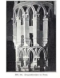 In der Vorhalle befand sich ein zur Seite offenes Treppentürmchen, das inzwischen verglast wieder aufgebaut wurde und heute den Aufgang zum Museum darstellt.[9] Der Baukörper entstand August Rudolf Gebser und Ernst August Hagen zufolge in der Zeit des Staatsgründers Herzogs Albrecht von Preußen.[10]