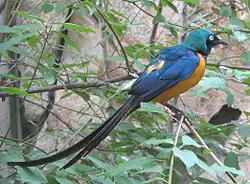 Der 35 Zentimeter lange Königsglanzstar ist an der Oberseite metallisch blaugrün gefärbt, die Brust ist violett und der Bauch goldgelb.