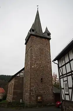 Das Ortsbild wird vom mächtigen, aus Bruchsteinen errichteten Kirchturm beherrscht. Er stammt aus dem 14. oder 15. Jahrhundert, ist das älteste Bauwerk im Dorf, und war ursprünglich wohl ein Wehrturm. Das alte Kirchenschiff, das vermutlich aus dem 16. Jahrhundert stammte, wurde wegen Baufälligkeit in den Jahren 1846–1848 durch einen rechteckigen Sandsteinbau im Biedermeierstil mit zweifach gekuppelten Rundbogenfenstern ersetzt. Architekt war der waldeckische Bauinspektor Wilhelm Brass, nach dessen Plänen auch die Kirchen in Hemfurth (1846/47) und Wellen (1846/49) entstanden. Die Sandsteinquader für den Bau wurden größtenteils aus Züschen und Heimarshausen mit Pferde- und Ochsengespannen herangeschafft. Die Innenausstattung und Geräte der Kirche stammen zumeist noch aus der Zeit dieses Neubaus. Die Orgel wurde beim Neubau der Kirche angeschafft und stammt von dem Korbacher Orgelbauer Vogt. Eine imposante ca. 90 Meter lange Mauer aus Steinquadern stützt die an einem Hang stehende Kirche ab.