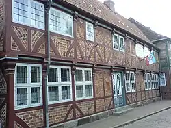 Das breite, zweistöckige Gebäude ist aus Backstein und in Fachwerk errichtet. Die Fächer sind reich in unterschiedlichen Formen gestaltet und die einzelnen Geschosse kragen in Richtung der Straße leicht vor. 1928 entging das Haus nur knapp einem Abriss und wurde in der Folgezeit saniert. Eine weitere, umfangreiche Sanierung fand von 1988 bis 1989 statt.