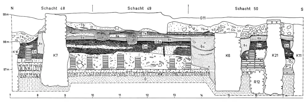 Über der Brandschicht, aber noch unter der folgenden Abbruchschicht der Pfalz breitete sich eine Steinstickung aus, die sicher als Unterbau eines Fußbodens diente. Somit ist davon auszugehen, dass zumindest Teile der Pfalz nach dem Brand nochmals aufgebaut wurden.[94] Die nun folgende starke graugelbe bis braune Abbruchschicht von 25 bis 100 cm Stärke bestand größtenteils aus Bauschutt, dem für die Pfalzbauten typischen kieshaltigen hellen Mörtel und karolingischen Steinquadern. Zahlreiche Ausbruchgruben zeigten, dass das hervorragende Steinmaterial für Neubauten reiche Zweitverwendung fand.[95]
