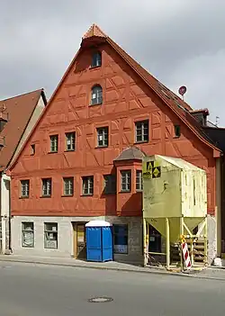 Der zweigeschossige und verputzte Giebelbau mit Sandsteinerdgeschoss besitzt ein polygonales Holzchörlein.