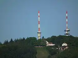 • Auf dem Gipfel wurde 1832 mit dem Bau eines ersten, achteckigen Aussichtsturms begonnen, der 1835 eingeweiht und an den dann 1911 außen ein Aufzug angebracht wurde.[10] Nach Fertigstellung des Fernsehturms wurde das Bauwerk abgerissen.[11][12]