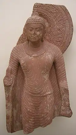 In der anikonischen Frühphase des Buddhismus wurde der Buddha durch Symbole wie einen Fußabdruck, einen leeren Stuhl, ein herrenloses Pferd oder einen Regenschirm dargestellt.[1] Erste Bildnisse des Buddha entstanden ab etwa dem 5. Jahrhundert B.E. in den Regionen Gandhara (dem heutigen Kandahar in Afghanistan) und Mathura.[1]