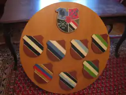 5. Das schwarze Corps Saxonia Konstanz führt heraldisch unten links das Wappen von Teutonia Halle Vollwappen des Corps Saxonia Konstanz.jpg
