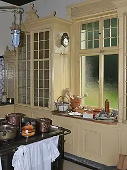 Eine höfische Mode bestand darin, neben der Küche, in der die Mahlzeiten zubereitet wurden, eine weitere Schauküche einzurichten, die, obwohl vollkommen funktionsfähig ausgestattet, der Präsentation von Porzellan- und Fayencesammlungen diente. Markgräfin Sibylla Augusta ließ sich in ihrem 1710–1711 erbauten Porzellanschloss Favorite bei Rastatt direkt unter ihren persönlichen Wohnräumen eine solche Schauküche einrichten, in der sie ihre reiche Sammlung an Fayencen und Geschirr präsentierte. Da die Küche niemals benutzt wurde, lässt sich daran heute der Originalzustand einer Kücheneinrichtung des frühen 18. Jahrhunderts ablesen. Die Idee, eine Prunkküche als Repräsentationsraum auszustatten, stammte aus Holland und wurde von protestantischen Fürstinnen und reichen Nürnberger Bürgerinnen übernommen. Es gab auch Gartenküchen, die nur mit Porzellan und Steingut bestückt waren.[4]