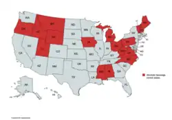 Der Verkauf von alkoholischen Getränken wird unterschiedlich von den Bundesstaaten oder Gemeinden kontrolliert. 17 Staaten betreiben staatseigene Liquor Stores mit einem staatlichen Monopol auf den Verkauf von Spirituosen und teilweise auch auf Wein und Bier. In den übrigen 33 Staaten ist Alkohol grundsätzlich frei im privaten Einzelhandel erhältlich.[2]