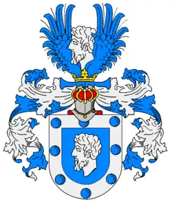 Innerhalb eines mit acht blauen Kugeln belegten silbernen Schildrandes in Blau ein rechtsgekehrter, bärtiger, abgehauener silberner Manneskopf. Auf dem Helm mit blau-silbernen Decken der Manneskopf zwischen offenen blauen Fluge.