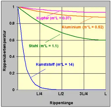 Im nebenstehenden Bild ist die (auf 1 normierte) Rippenübertemperatur ΔT an einer Rippe der Länge L für verschiedene Werte der Kenngröße (m  · L) dargestellt. Die Kenngrößen (m  · L) wurden für eine 0,5 mm starke und 30 mm hohe rechteckige Rippe (A = 15 mm²; U = 61 mm) aus vier unterschiedlichen Materialien im Luftstrom bei einem Wärmeübergangskoeffizienten h = 15 W/m2/K berechnet. Bei den Kupfer- und Aluminiumrippen (m  · L = 0,37 bzw. 0,52) beträgt der Temperaturabfall zu Rippenspitze weniger als 10 %, diese Rippen haben eine nahezu ideale Kühlwirkung. Bei der Kunststoffrippe (m  · L = 14) fällt jedoch bereits nach einem Viertel der Länge (L/4) die Rippenübertemperatur auf weniger als 5 % des Anfangswertes, diese Rippe ist für die Kühlung praktisch unwirksam.
