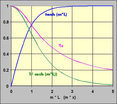 Die Kühlwirkung einer Rippe nimmt also mit steigendem Temperaturabfall von der Rippenbasis zu Rippenspitze ab. Maßgeblich für diesen Temperaturabfall ist nach den obigen Gleichungen die dimensionslose Kenngröße (m  · L).