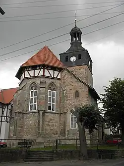 - Die evangelische Kirchengemeinde nutzt die um 1520 neu errichtete Dionysius-Kirche mit einem achteckigen Taufstein von 1576.