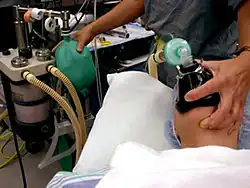 Als Alternative zur Intubation (und somit zur „invasiven“ Beatmung) kann unter bestimmten Voraussetzungen eine nichtinvasive Beatmung (englisch non-invasive ventilation, NIV) eingesetzt werden.[6][7][8] Darunter wird eine meist automatische (maschinelle) Beatmung über Gesichtsmasken, Mund-Nasen-Masken oder Beatmungshelme verstanden, bei der keine künstlichen Atemwege wie Endotrachealtubus, Larynxmaske oder Trachealkanüle als Schläuche in den Körper eingeführt werden und bei der auf eine Sedierung weitgehend (falls die erhebliche zusätzliche psychische Belastung vor allem bei Beginn einer NIV dies zulässt) verzichtet werden kann, wobei Nachteile der invasiven Beatmung (z. B. Infektionen bei immunsupprimierten Patienten) vermieden werden sollen.[8]:S. 308–311 und 313
