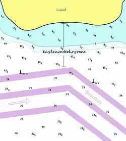Die Küstenverkehrszone ist kleineren Booten, Segelschiffen sowie Motorschiffen, deren Länge 20 m nicht überschreitet, vorbehalten. Größere Motorfahrzeuge müssen gemäß Anlaufbedingungsverordnung das seewärts gelegene Verkehrstrennungsgebiet befahren.