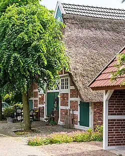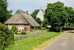 Das eingeschossige Zweiständer-Hallenhaus in Fachwerk mit Steinausfachungen, reetgedecktem Krüppelwalmdach und Niedersachsengiebeln sowie der mittigen Grooten Door mit Rundbogen wurde 1727 (Inschrift) auf einer Wurt unmittelbar westlich vor der Kirche gebaut. Die Traufwände und der Wohngiebel wurden später in Backstein ersetzt.