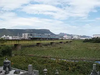 ![]() mit Yashima im Hintergrund Ein Nahverkehrszug fährt über den Fluss Kasuga mit Yashima im Hintergrund | |