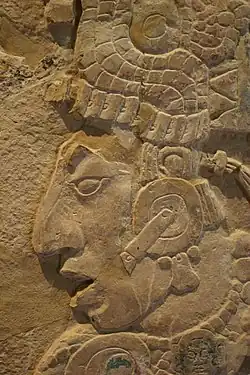 Bildnis von K’inich Kan Balam II. auf einem Relief aus Tempel XVII in Palenque
