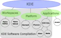 - die Anwendungen aus KDE Gear (früher KDE Applications), die zusammen in einem regelmäßigen Zyklus veröffentlicht werden.