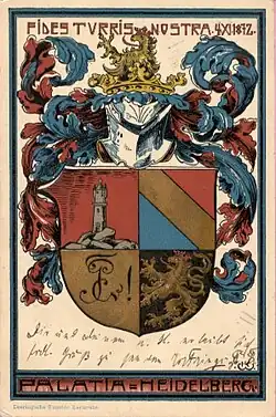Die Palatia hat die Farben "Rot-Gold-Himmelblau"[1] mit goldener Perkussion. Die Farben Gold und Rot stehen für Baden und Blau für das alte Heidelberger Fürstengeschlecht der Wittelsbacher. Diese untersagten auch der Palatia das Königsblau. Aus diesem Grund tragen die Heidelberger Palaten Himmelblau im Banner. Der Wahlspruch lautet "Fides Turris Nostra" und bedeutet aus dem lateinischen übersetzt "Der Glaube ist unser Turm" Der Name Palatia wurde gewählt um den Bezug zu Heidelberg zu bekräftigen. Palatia ist das lateinische Wort für die Pfalz (Kurpfalz), deren Hauptstadt lange Zeit Heidelberg war.