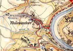 Skizze des KZ-Außenlagers Königstein nahe Thürmsdorf und täglicher Weg der Häftlinge zur Zwangsarbeit im Steinbruch Niedere Kirchleite am Objekt Schwalbe II (rot gekennzeichnet)