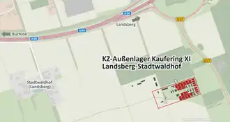 Lage KZ-Außenlager Kaufering XI – Landsberg-Stadtwaldhof in Bayern. |