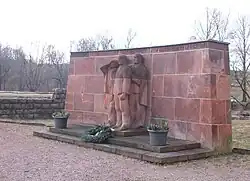 Nach dem Zweiten Weltkrieg wurden Mahnmale auf dem ehemaligen Gelände des KZ Sachsenburg errichtet. Im Ortswappen von Sachsenburg erinnert bis heute ein rotes Dreieck an die politischen Häftlinge des Lagers. 1974 wurde in dem von einer volkseigenen Zwirnerei genutzten Fabrikgebäude von der SED ein Gedenkraum eingerichtet.[40] Darin wurde die staatliche Ordnung der DDR als „antifaschistisches Erbe“ der ehemaligen politischen Häftlinge dargestellt. Insbesondere Jugendgruppen besuchten die Gedenkstätte und wurden dabei vom Sachsenburger Lehrer Gottfried Weber und dessen Frau betreut. Nach dem Ende der DDR wurde die Ausstellung im ehemaligen Fabrikgebäude in Sachsenburg geschlossen, das 1968 errichtete Mahnmal blieb erhalten.