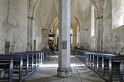 Die ursprünglich einschiffige Peter-und-Paul-Kirche wurde wahrscheinlich in der zweiten Hälfte des 13. Jahrhunderts als Wehrkirche errichtet. Um 1470 wurde der Kirchturm hinzugefügt, wahrscheinlich der erste auf der Insel Saaremaa. Im 15. Jahrhundert wurde das Gotteshaus zu einer zweischiffigen Kirche ausgebaut, nachdem die Gewölbe eingestürzt waren. Eine Besonderheit stellt das Dreifachfenster an der Ostwand dar, eines der Lieblingsmotive der Zisterzienser-Baukunst.
