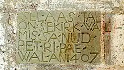 Der (ältere) Altar ist eine Schenkung des Gutsherrn Berent von Berg aus dem Jahr 1547. Die Kanzel von 1645 ist ein Werk des Meisters Jakob Jakobson.[3] Neben dem Westportal befindet sich möglicherweise der älteste Text in estnischer Sprache. Die Inschrift verweist auf das Jahr 1407, dürfte aber vermutlich jünger sein.