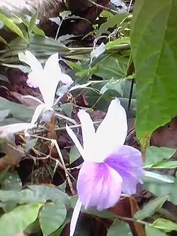 Die zwittrigen Blüten sind zygomorph und dreizählig mit doppelter Blütenhülle. Die Blütenhüllblätter sind weiß bis purpurfarben. Die drei Kelchblätter sind röhrig verwachsen; die Kelchröhre ist auf einer Seite gespalten und endet in zwei oder drei ungleichen Kelchzähnen. Die Kelchröhre ist viel kürzer bis gleich lang wie die Kronröhre. Die drei Kronblätter sind röhrig verwachsen. Die drei fast gleichen Kronlappen sind lanzettlich und ausgebreitet oder zurückgekrümmt. Die seitlichen Staminodien des äußeren Staubblattkreises sind kronblattartig. Zwei Staminodien des inneren Kreises bilden die auffällige, meist weiße oder purpurfarbene Lippe (Labellum), die manchmal an ihrer Basis anders gefärbt ist. Die Lippe ist zweilappig bis zweispaltig. Nur im inneren Staubblattkreis ist ein Staubblatt fertil. Es sind höchstens kurze Staubfäden erkennbar. Drei Fruchtblätter sind zu einem unterständigen, dreikammerigen Fruchtknoten verwachsen.[1]