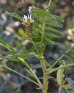Die wechselständig am Stängel angeordneten Laubblätter sind in Blattstiel und -spreite gegliedert sowie insgesamt 4 bis 18 Zentimeter. Die Blattspreite ist unpaarig gefiedert mit 6 bis etwa 15 Paaren Fiederblättchen.[5] Der Blattstiel ist 0,5 bis 1,5 Zentimeter lang und behaart.[5] Die rinnenförmige Rhachis ist behaart.[6] Die Blättchen sind bei einer Länge von 6 bis 25, selten bis zu 35 Millimetern sowie einer Breite von 3 bis 10, selten bis zu 13 Millimetern eiförmig bis länglich mit ganzem Rand[5] und eingebuchten bis gerundetem oberen Ende.[6] Die Blattoberseite ist kahl[5] und die Unterseite ist fein behaart.[6] Die 7 bis 15 Millimeter langen Nebenblätter sind, meist weiß oder gemischt weiß und schwarz, behaart und am Rand bewimpert.[5]