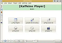Kaffeine (nicht: Caffeine) ist ein freier Mediaplayer für Linux. Das Programm ist unter der GNU General Public License veröffentlicht worden und kann somit kostenlos benutzt und verteilt werden. Es nutzt die Möglichkeiten der Benutzeroberfläche KDE und passt sich daher mit seinem Bedienkonzept und dem sogenannten „Look and Feel“ in diese Benutzerumgebung vollständig ein.