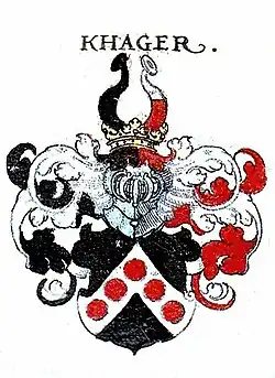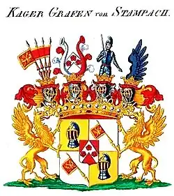 - ↑ AT-OeStA/AVA Adel RAA 214.23 Kager von Stampach, Karl, General der Kavallerie und Oberst eines Kürassierregiments, Johann, Franz, Söhne seines Bruders, Verleihung erbländischer Grafenstand, "Hoch- und Wohlgeboren", 1756.08.04 (Akt (Sammelakt, Grundzl., Konvolut, Dossier, File)). Abgerufen am 21. März 2023.